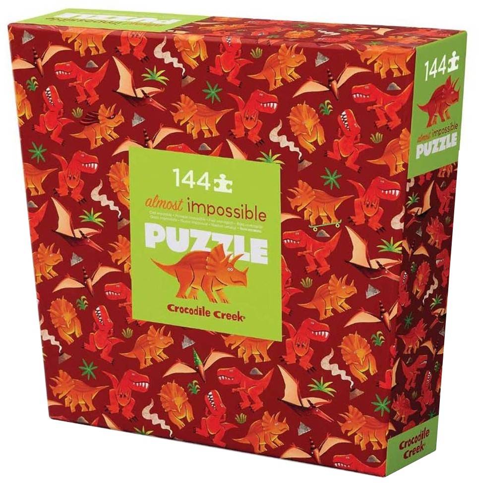 Puzzle Niemożliwe – Świat Dinozaurów 144el., Crocodile Creek Dzieci kochają wyzwania! Te puzzle są o wiele bardziej wymagające niż zwykłe puzzle, ale wciąż możliwe do ułożenia. Na czerwonym tle mamy powtarzające się motywy dinozaurów i wulkanów. Układanie puzzli ćwiczy koncentrację, pomaga się wyciszyć i odstresować. Dzieci je uwielbiają!